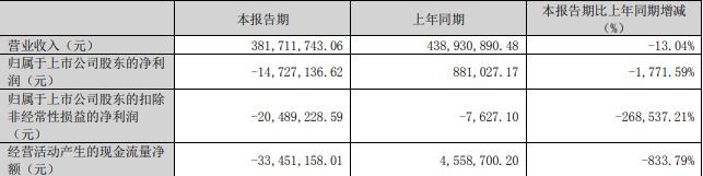 据蓝丰生化2023年一季度报告,报告期内,公司实现营业收入3.82亿元,同比减少13.04%;归属于上市公司股东的净利润-1472.71万元,同比减少1771.59%;归属于上市公司股东的扣除非经常性损益的净利润-2048.92万元,同比减少268537.21%;经营活动产生的现金流量净额-3345.12万元,同比减少833.79%。