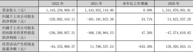 据蓝丰生化2022年年报,报告期内,公司实现营业收入14.45亿元,同比增长0.09%;归属于上市公司股东的净利润-3.21亿元,同比增长34.71%;归属于上市公司股东的扣除非经常性损益的净利润-2.56亿元,同比增长47.26%;经营活动产生的现金流量净额-6433.59万元,同比减少645.38%。