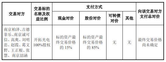 同日,华嵘控股发布发行股份及支付现金购买资产并募集配套资金暨关联交易预案。上市公司拟通过发行股份及支付现金的方式购买南京柏泽、古德菲乐、南京诚可信、高爽、刘明忠、赵霞、葛文野、王正根、张慧、南京喆涵10名交易对方持有的开拓光电100%股权。其中,以发行股份方式支付总交易对价的85%,以现金方式支付总交易对价的15%。