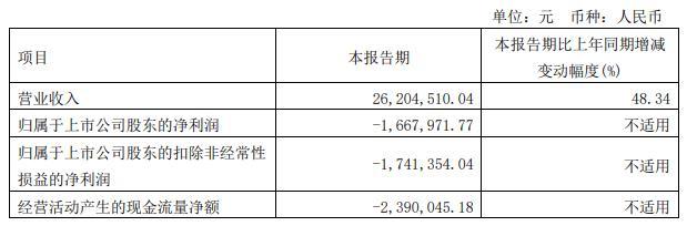 华嵘控股2023年第一季度报告显示,2023年一季度,华嵘控股实现营业收入2620.45万元,同比增长48.34%;归属于上市公司股东的净利润-166.80万元;归属于上市公司股东的扣除非经常性损益的净利润-174.14万元;经营活动产生的现金流量净额-239.00万元。