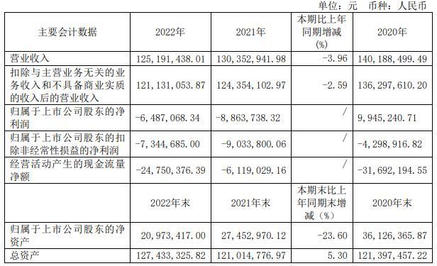华嵘控股2022年年度报告显示,2022年,华嵘控股实现营业收入1.25亿元,同比下滑3.96%;归属于上市公司股东的净利润-648.71万元;归属于上市公司股东的扣除非经常性损益的净利润-734.47万元;经营活动产生的现金流量净额-2475.04万元。