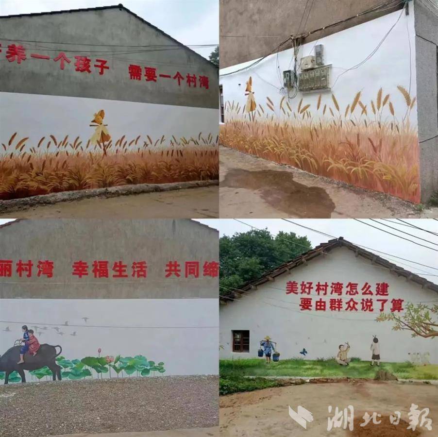 房前屋后的卫生做好了,乱堆乱放也码整齐了,花花草草要种起来,文化氛围可不能少!小李村与凤凰社区依托“五方联建”的大平台,组织湖北美术学院的学生到小六湖湾,开展美丽乡村的文化墙行动,既让村民的房子美起来,刮起一阵文明乡村的清新风。