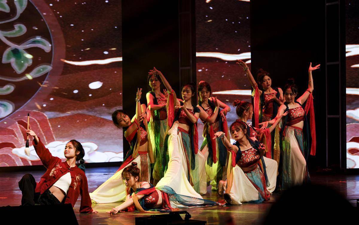 两出舞蹈也给观众带来深刻的印象。舞蹈《千年画卷》中,敦煌壁画中的“飞天侍女”随琵琶声翩翩起舞,穿越千年来到观众眼前,身着盘扣龙纹唐装的功夫少年,执笔挥墨,古典舞和中国功夫的碰撞,柔美与力量相融合。舞蹈《漆奁楚女图》则用水袖和舞步生动再现了千年前楚国少女浣衣嬉戏之景,独具线条美与律动美。