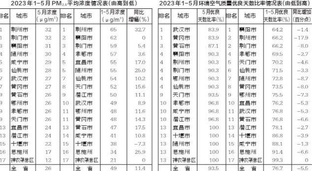 2023年1-5月,全省17个重点城市PM_2.5累计浓度均值为49μg/m^3,较去年同期上升11.4%。17个重点城市平均空气质量优良天数比率为76.7%,较去年同期减少5.5个百分点。17个重点城市PM_10累计浓度均值为81μg/m^3,较去年同期上升19.1%。