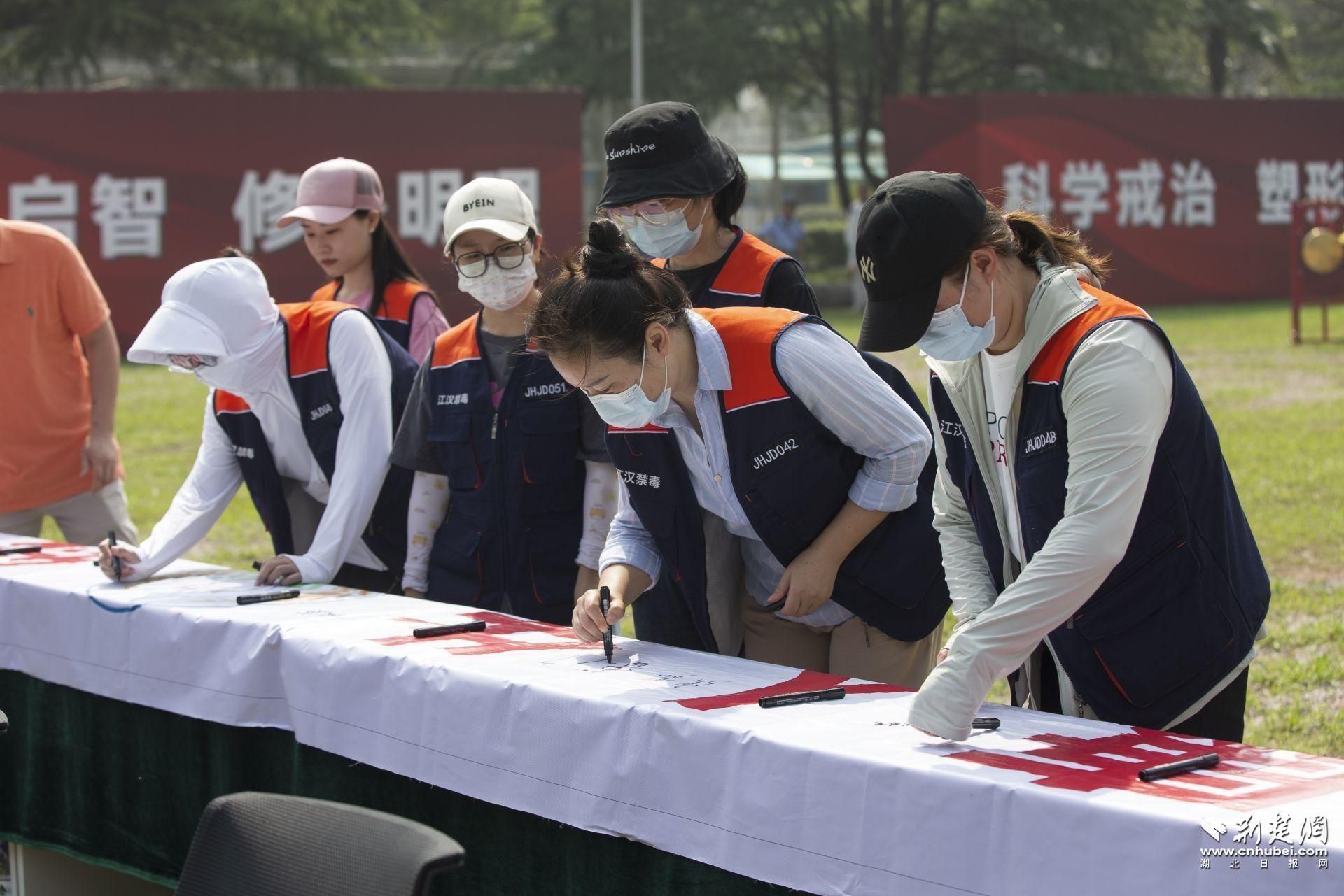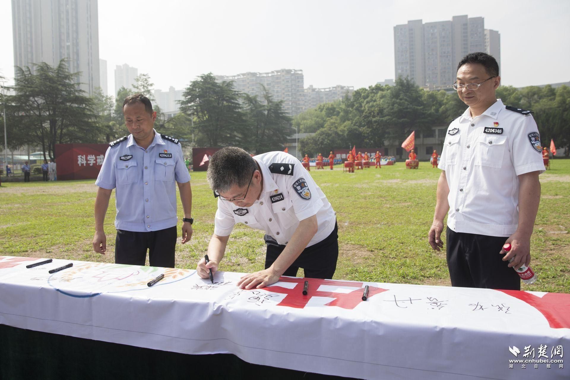 武汉市司法局分管领导韩毓龙在禁毒宣传横幅上签名。刘建维 摄