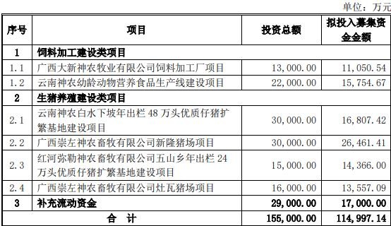 本次向特定对象发行股票拟募集资金总额不超过114,997.14万元(含本数),扣除发行费用后募集资金净额将全部用于投资饲料加工建设类项目(含广西大新神农牧业有限公司饲料加工厂项目、云南神农幼龄动物营养食品生产线建设项目)、生猪养殖建设类项目(含云南神农白水下坡年出栏48万头优质仔猪扩繁基地建设项目、广西崇左神农畜牧有限公司新隆猪场项目、红河弥勒神农畜牧有限公司五山乡年出栏24万头优质仔猪扩繁基地建设项目、广西崇左神农畜牧有限公司灶瓦猪场项目)、补充流动资金。