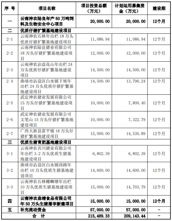 神农集团2021年4月27日披露的招股书显示,公司拟募集资金209,143.44万元,分别用于云南神农陆良年产50万吨饲料及生物安全中心项目、优质仔猪扩繁基地建设项目、优质生猪育肥基地建设项目、云南神农曲靖食品有限公司年50万头生猪屠宰新建项目、补充流动资金。