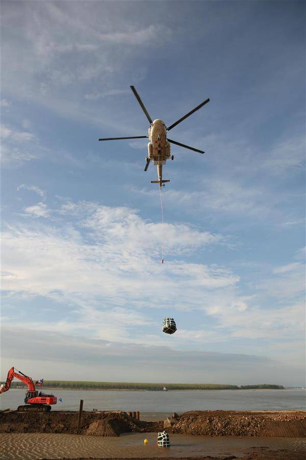 中国安能武汉救援基地救援分队用钢板植桩机在决口下游植入钢板桩,固基拦截物料。该打桩机具有植桩效率高、植入深度大、抗滑能力强,在实战中多次运用。卡-32、米—171直升机在溃口上游10米处抛投巨包袋,加固裹头、降低流速,与陆地封堵协同作战。
