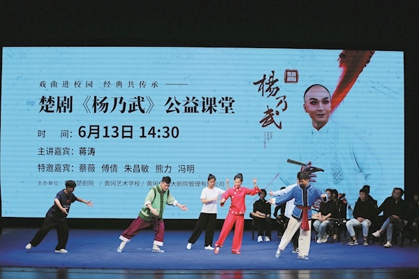 在黄冈,国家一级演员谢思琴走进黄冈市实验小学,教孩子们学唱《天仙配》经典唱段“树上的鸟儿成双对”,青年演员们在演完《打猪草》后手把手指导孩子们体验“打马鞭”,一招一式让大家过足戏瘾;汉剧《夫人城》走进黄冈职业技术学院,为500名学生上了一堂生动的戏曲公益课:原来,旦角的水袖可以通过不同的表演体现激动、欢愉、尴尬等不一样的情绪;而生角的髯口(胡子)也可以通过不同的方式体现喜怒哀乐……
