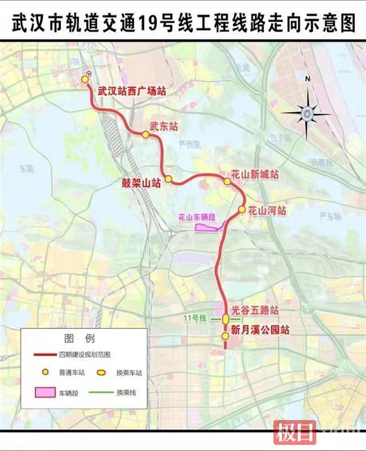地铁19号线工程起于武汉站西广场站,线路沿武东路、花城大道、花山大道、光谷五路走行,止于新月溪公园站,全长约23.3公里,全为地下线,设车站7座。全线共设2座换乘站,在光谷五路站与11号线换乘,在新月溪公园站预留了与远期13号线换乘的条件。