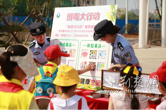 荆楚网(湖北日报网)讯(通讯员 黄翔)“这些模型中哪些是新型毒品,大家能分辨吗?”6月24日,沙洋县平湖游乐园里游人如织,沙洋县公安局民警与青少年进行问答互动,开展禁毒知识宣传。