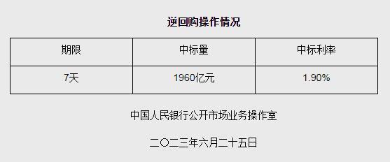 中新网6月25日电 据央行网站25日消息,为维护半年末流动性平稳,2023年6月25日人民银行以利率招标方式开展了1960亿元逆回购操作,期限为7天,中标利率为1.90%。(中新财经)