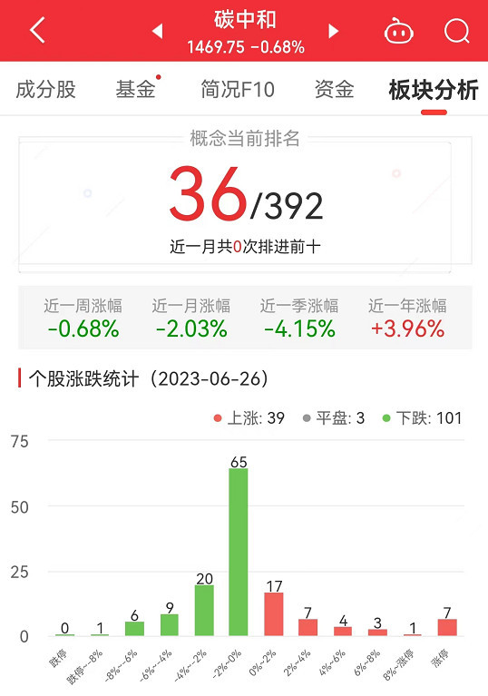中国经济网北京6月26日讯 今日,碳中和板块整体跌幅0.68%,其中,39只股票上涨,3只股票平盘,101只股票下跌。