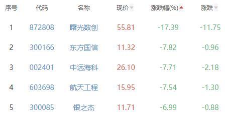 曙光数创、东方国信、中远海科、航天工程、银之杰位列涨幅榜后五位,涨幅分别为-17.39%、-7.82%、-7.71%、-7.54%、-6.99%。