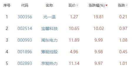 其中,光一退、宝馨科技、闽东电力、豫能控股、京能热力位列板块涨幅前五位,涨幅分别为19.81%、10.02%、9.99%、9.98%、9.97%。