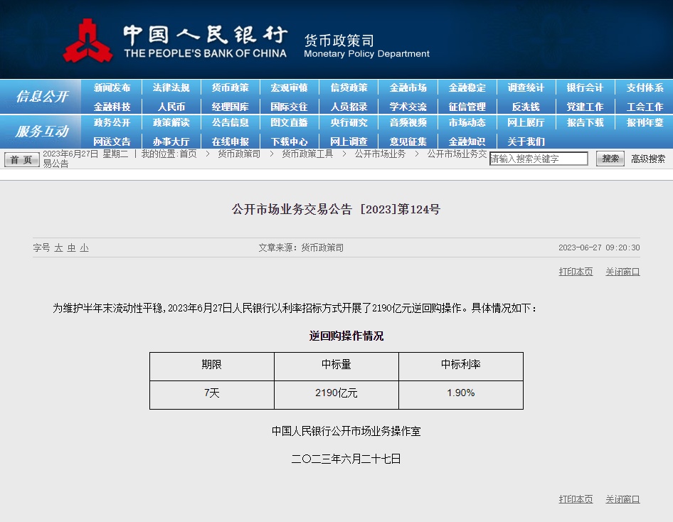 人民网北京6月27日电 (记者罗知之)据人民银行官网消息,为维护半年末流动性平稳,2023年6月27日人民银行以利率招标方式开展了2190亿元逆回购操作。期限7天,中标利率1.9%。