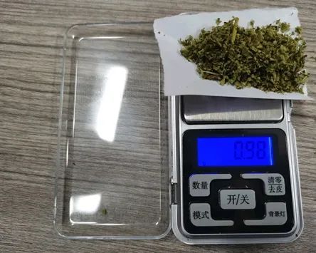 对嫌疑人家中查获的部分“烟丝”进行称重。
