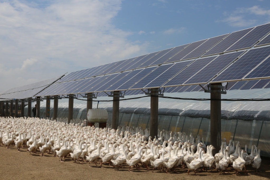 在舒兰市环城街道重礼村占地近4万平米的光伏电站,光伏板和鹅舍间隔排列,光伏阵列整齐划一,像是为鹅舍订制的遮阳伞。“这是‘企业+光伏’牧光互补养殖模式。”“80后”谭忠来一进鹅舍,几千只小鹅急忙跑到一边并齐刷刷盯着他,“目前三个光伏养殖区仔鹅存栏数近10万只,去年出栏33600只,实现利润44万元。”