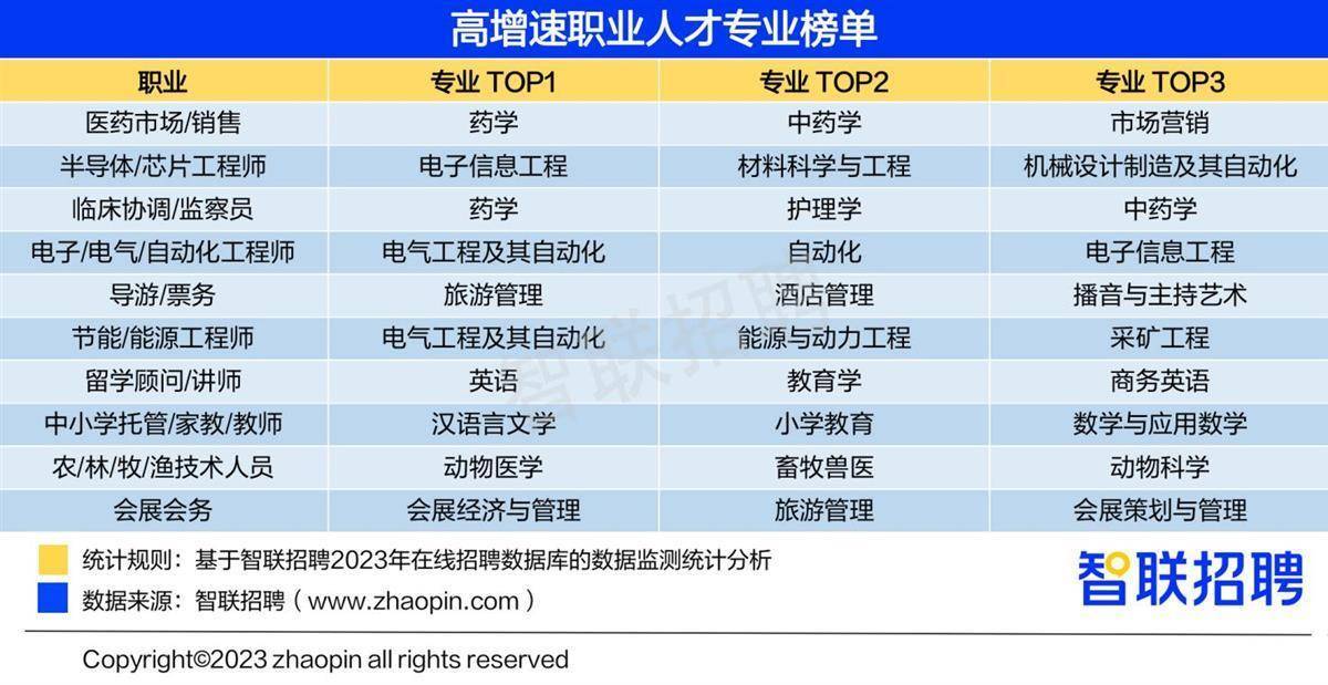 高潜力行业人才专业榜显示,医药市场/销售、半导体/芯片工程师等职业的高校毕业生需求增速高于全行业,榜单中职业的高校毕业生招聘增速均高于20%。药学、中药学是通往医药市场和临床协调高增长职业的“必由之路”,而电子信息、机械设计等复合型专业,则成为半导体/芯片职业的入职“基石”。