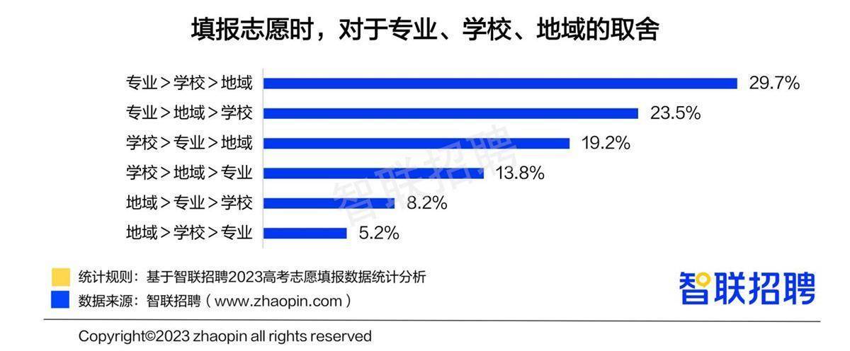 专业、院校、地域谁先谁后?北京大学国家发展研究院助理教授胡佳胤建议准大学生们在取舍时,以目标为导向综合考虑,评估自己是否做出了离个人目标和经济社会发展大势最近的选择。而衡量离目标距离远近的标准可以是地理区位(如一线城市、目标公司聚集的城市、实习和就业机会更多的城市等)、人际网络(如学校资源、校友网络、学生培养方案设计等)、专业发展趋势(如与数字经济、新兴产业、科技创新、政策导向相关的专业等)或自身兴趣志向。