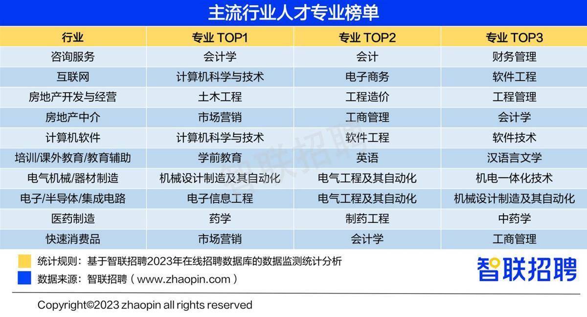主流行业人才专业榜显示,截至今年5月,咨询服务、互联网、房地产开发与经营等行业的高校毕业生招聘需求占比位列前十,比例接近全行业的60%。咨询服务对从业者专业适配度要求较高,会计学等专业占据前三。计算机、软件等相关专业背景,对于互联网等IT行业而言是名副其实的“敲门砖”,而工程造价、工程管理是通往房地产行业的“通行证”。