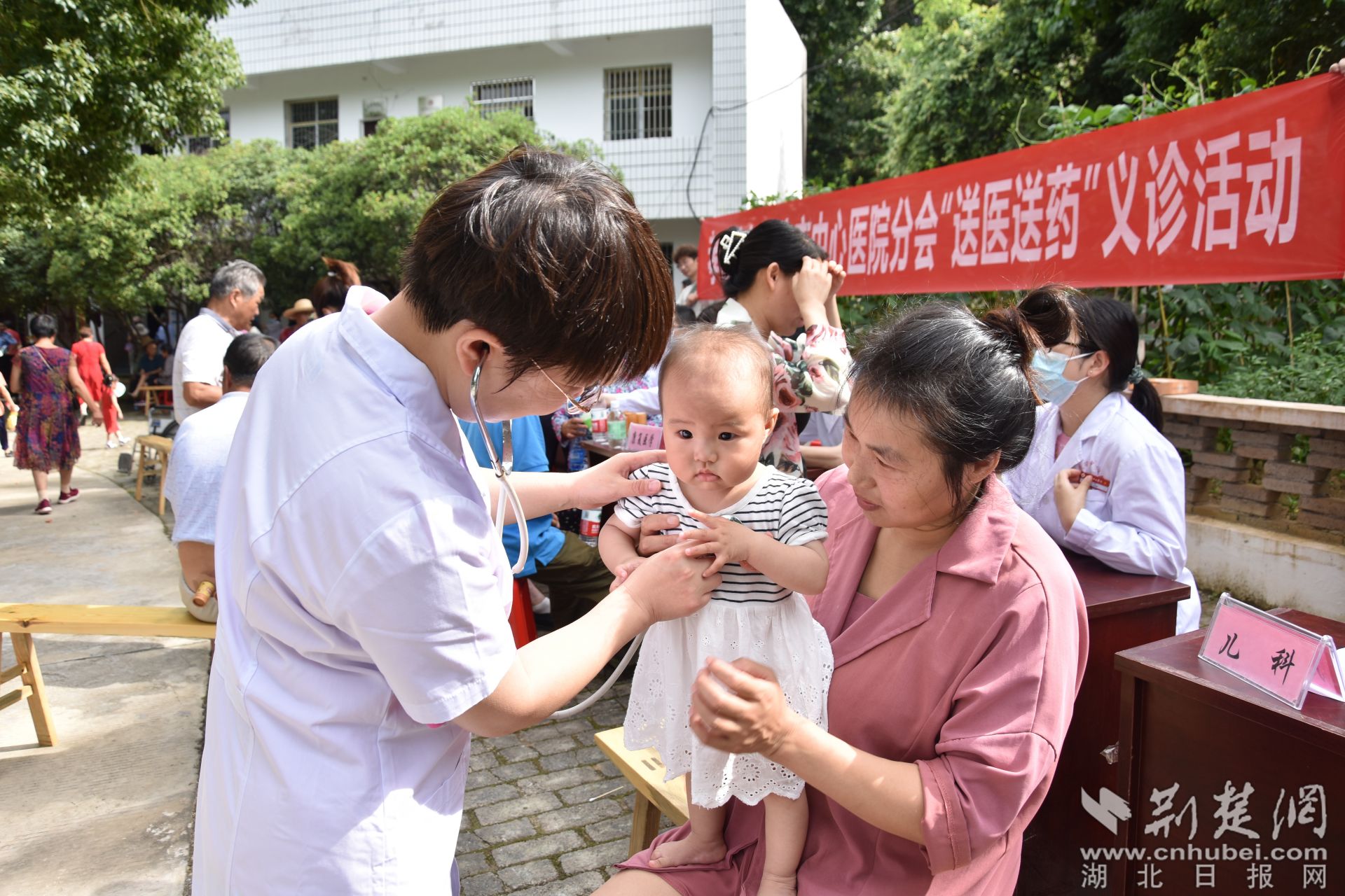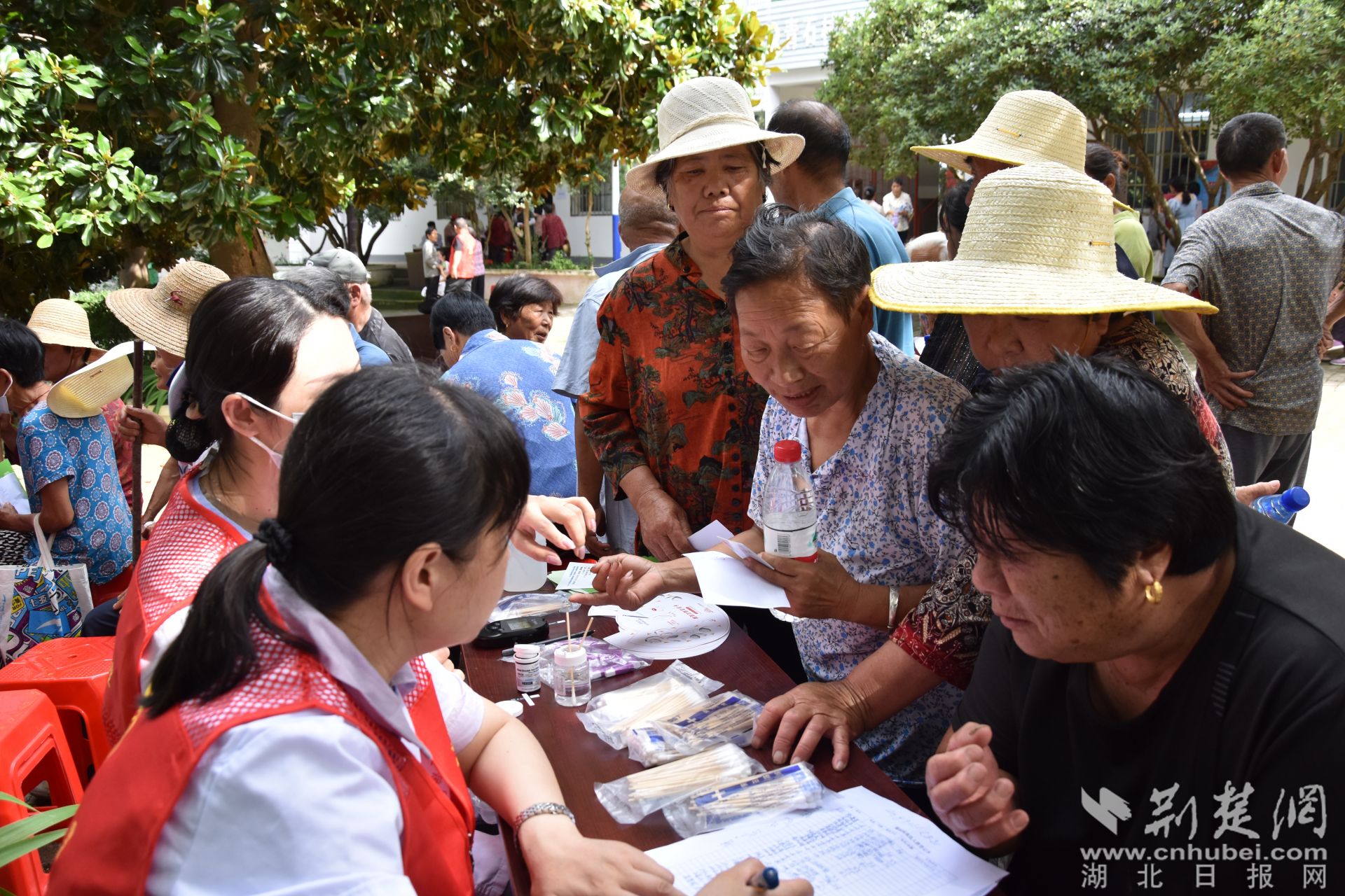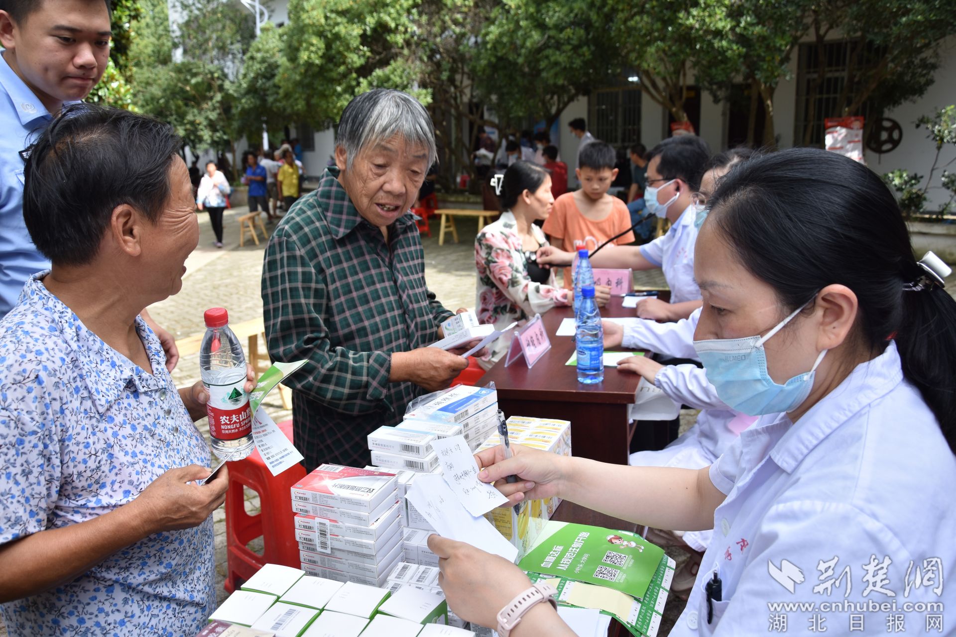 荆楚网(湖北日报网)讯(记者叶修颀 通讯员管菊艳、罗津) 6月28日上午,在孝昌县小悟乡青石村党群服务中心门口的空地上,前来接受免费义诊的村民熙熙攘攘、络绎不绝。医务人员热情地接待每一位前来咨询的就诊群众,问诊群众症状,根据病情提供治疗建议,同时为群众发放了治疗疼痛、高血压等症状的药物,细心嘱咐他们按时吃药。