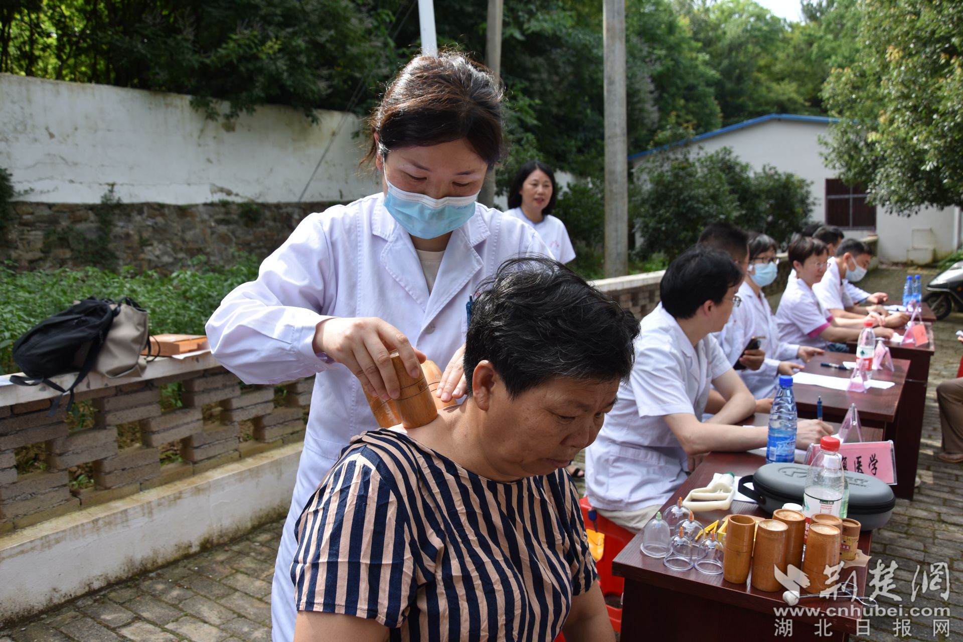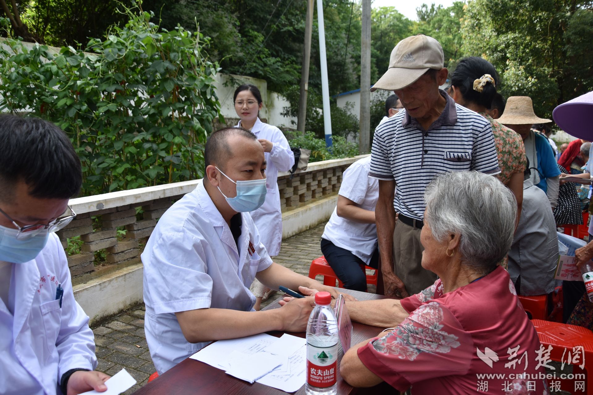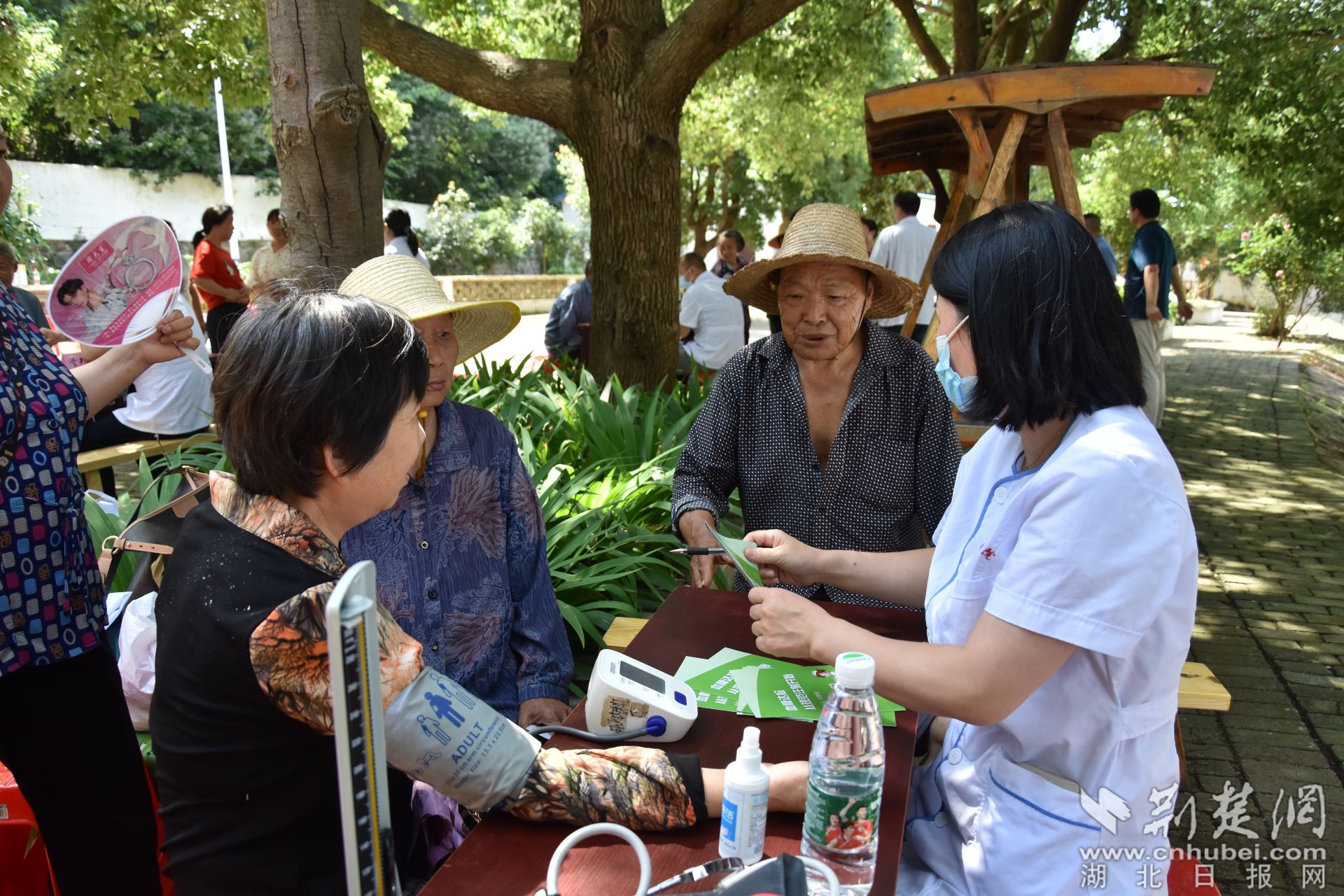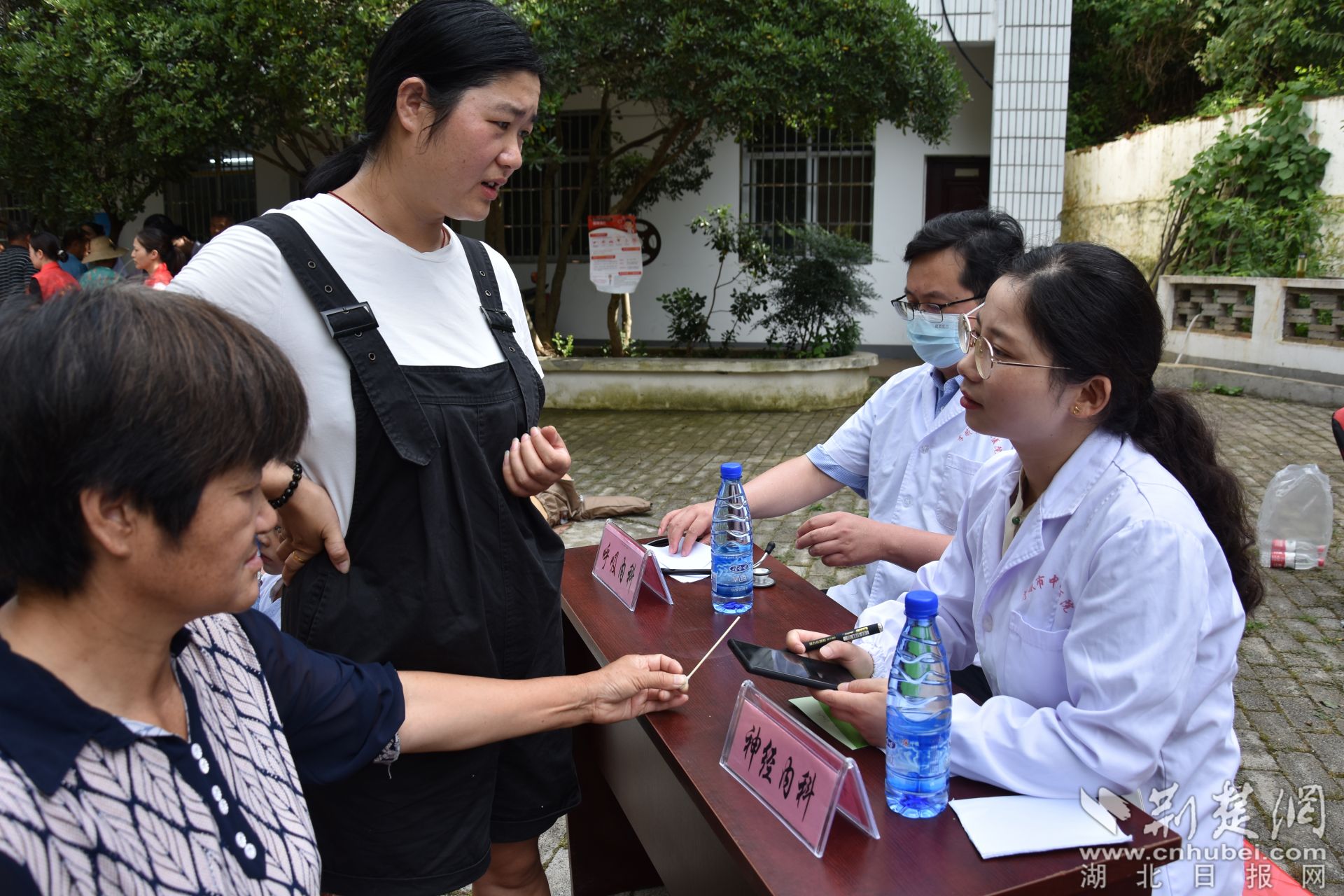 荆楚网(湖北日报网)讯(记者叶修颀 通讯员管菊艳、罗津) 6月28日上午,在孝昌县小悟乡青石村党群服务中心门口的空地上,前来接受免费义诊的村民熙熙攘攘、络绎不绝。医务人员热情地接待每一位前来咨询的就诊群众,问诊群众症状,根据病情提供治疗建议,同时为群众发放了治疗疼痛、高血压等症状的药物,细心嘱咐他们按时吃药。