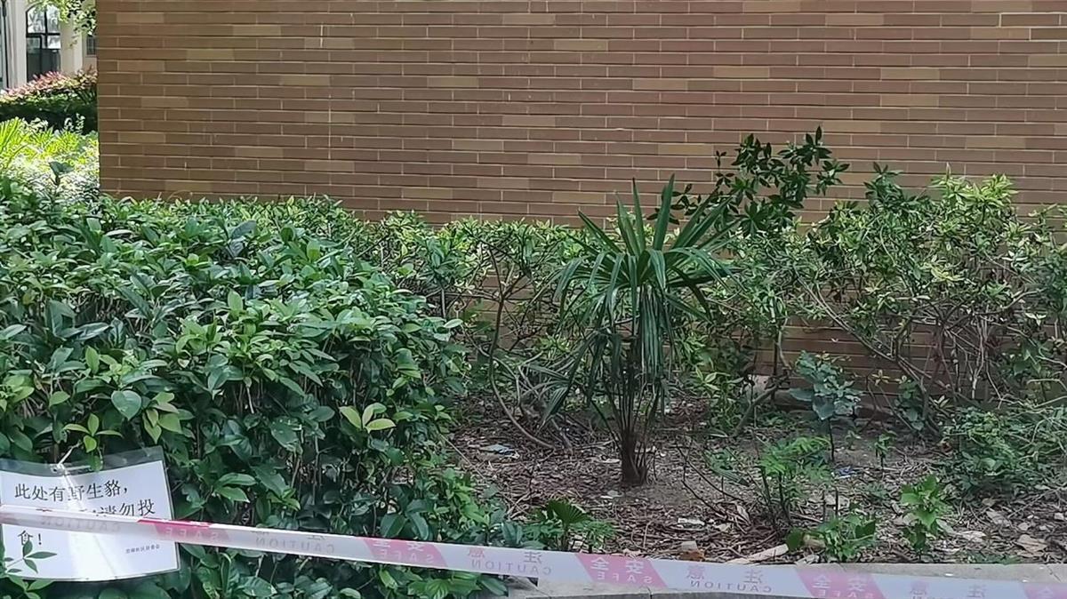 6月28日,记者跟随社区工作人员来到貉出没地点,其周围已被拉上警戒线,旁边的垃圾桶已被移开,树木与草丛上挂有提示牌:“此处有野生貉,请勿靠近,请勿投食!”