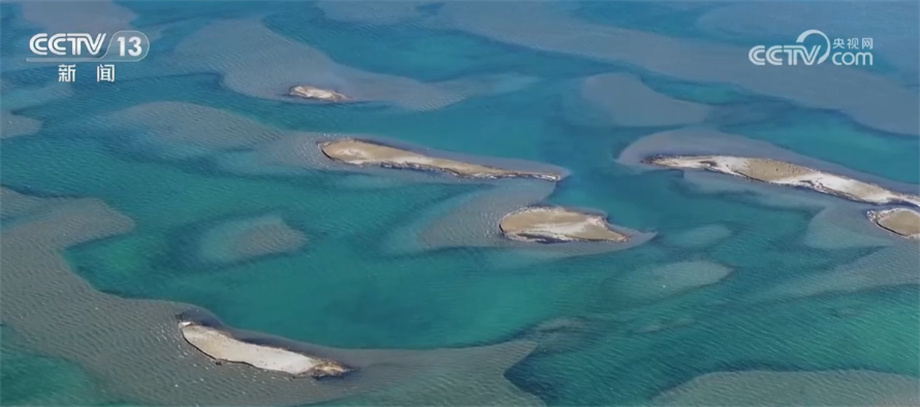那么,其他的鱼鸥又迁徙到了哪里呢?据青海湖国家级自然保护区管理局的工作人员介绍,他们观察到有一部分鱼鸥迁徙到了海西皮岛边的“沙尖”地带。于是我们一路向北继续航行大约20多公里,来到了海西皮岛边的“沙尖”地带。为了不打扰到水鸟,我们用无人机远距离拍摄。通过无人机画面,我们看到几只白色的鸟在低空飞行,远一点的沙滩处还有一些白色的小点点。随行的保护区工作人员说,这些白色的鸟就是鱼鸥和它们的幼鸟,这个时间是鱼鸥的捕食时间,还有一些大鱼鸥可能外出捕鱼去了。那么除了这里,鱼鸥是否还有别的繁殖地呢?