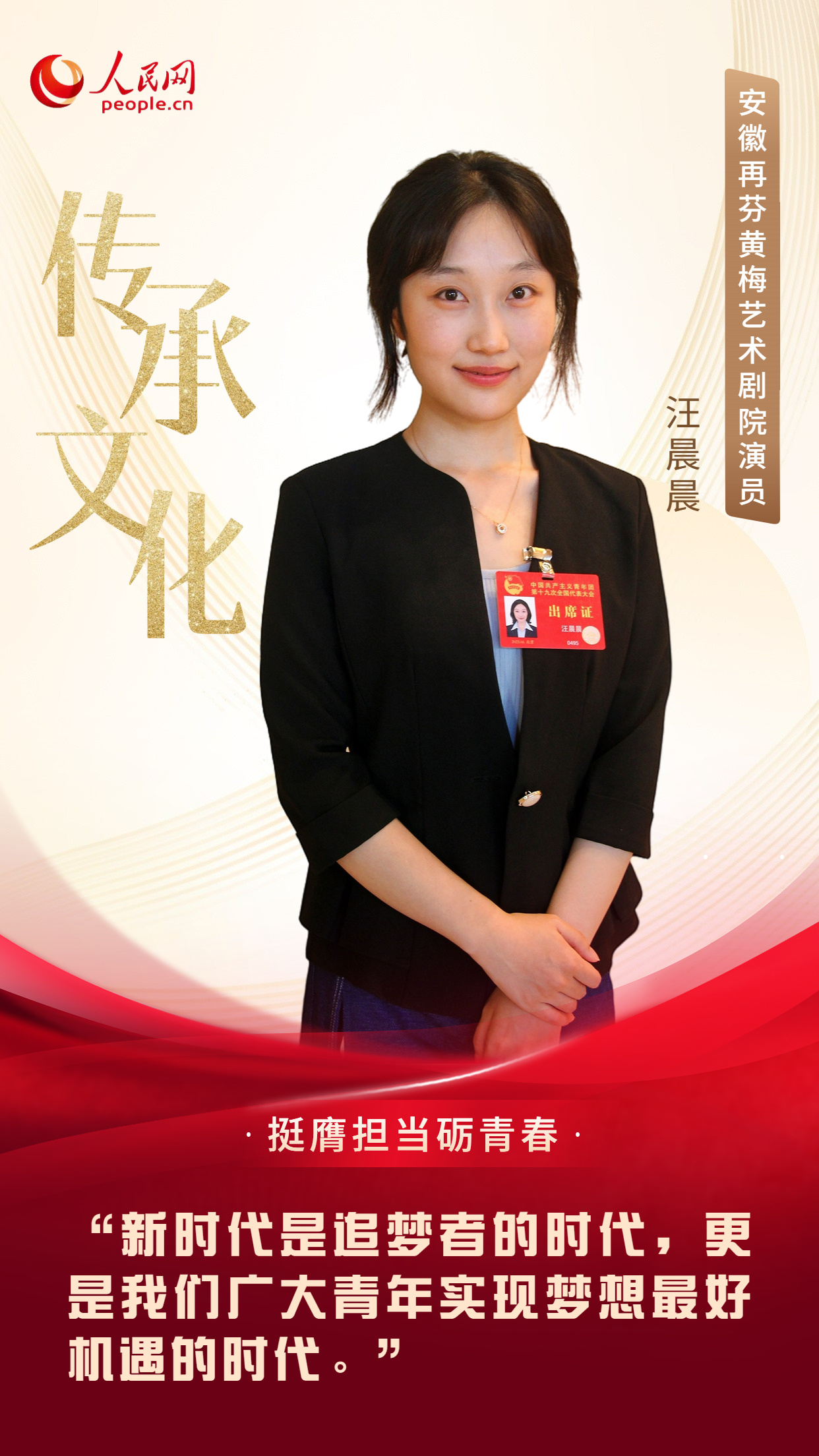 汪晨晨,2001年出生,共青团十九大代表,现为安徽再芬黄梅艺术剧院演员。