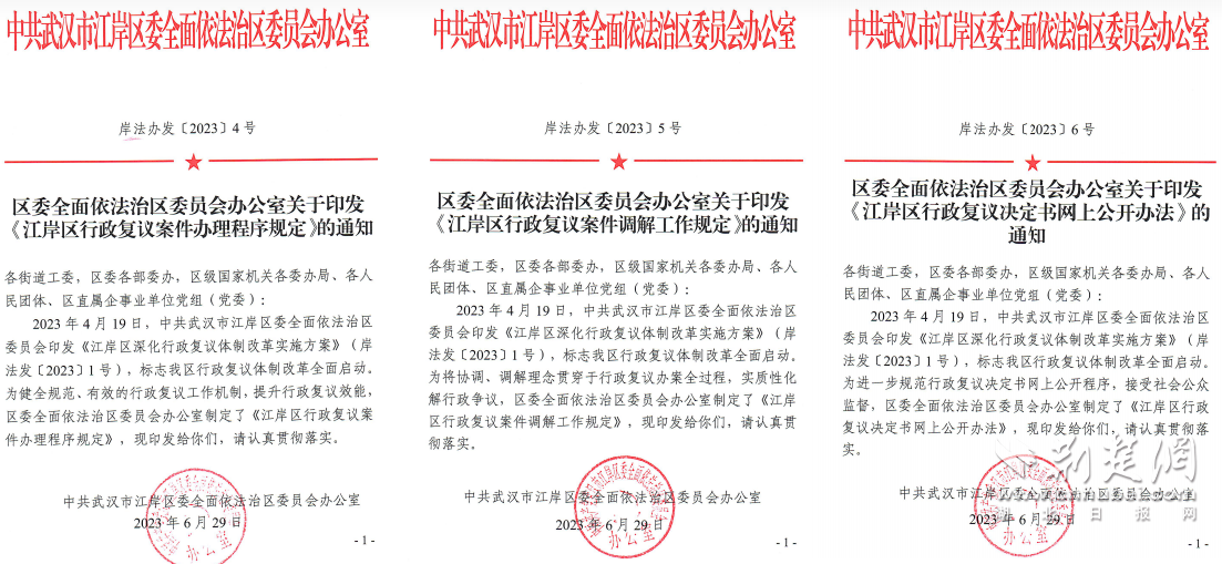 荆楚网(湖北日报网)讯(通讯员孙荣荣 张威)6月29日,江岸区全面依法治区委员会办公室正式印发《江岸区行政复议案件办理程序规定》、《江岸区行政复议案件调解工作规定》以及《江岸区行政复议决定书网上公开办法》三项规定,推动江岸区行政复议工作迈上工作流程更规范、复议决定更透明、化解争议更高效的新台阶。