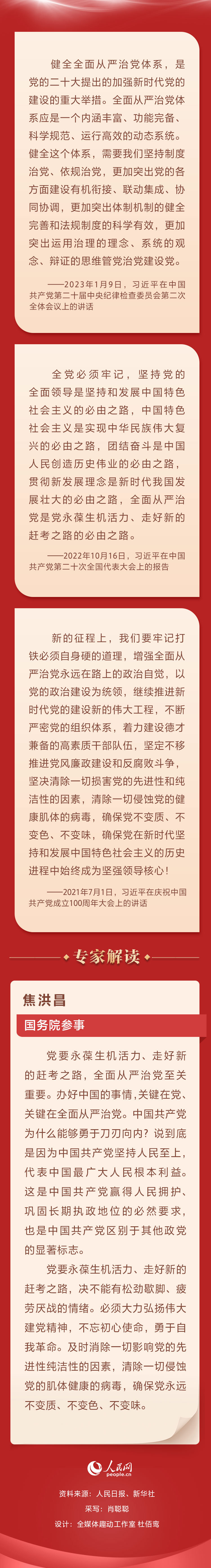 习近平总书记在党的二十大报告中指出“全面从严治党是党永葆生机活力、走好新的赶考之路的必由之路”。党的十八大以来,以习近平同志为核心的党中央把全面从严治党作为新时代党的建设的鲜明主题。人民网带您重温重要论述并邀请专家解读。