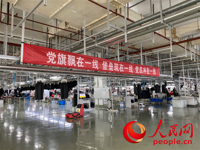 走进红豆集团5G智能全连接工厂,“党旗飘在一线 堡垒筑在一线 党员冲在一线”的横幅率先映入眼帘,沿着走廊望去,车间上方悬挂的“党员示范区”“党员示范团队”等牌匾格外醒目。