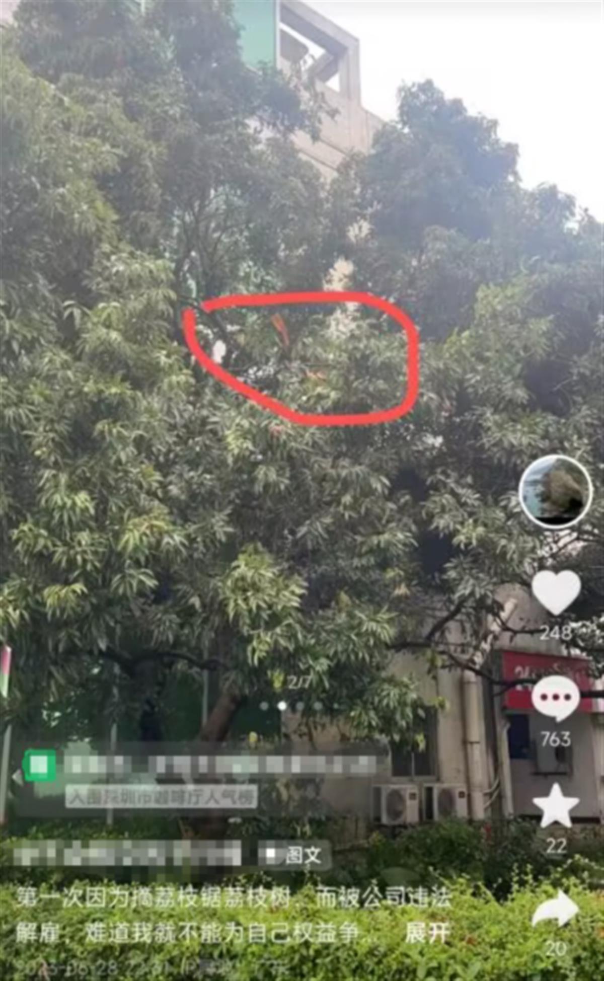 6月30日,当事人董先生告诉极目新闻记者,他来自四川,之前在深圳市龙华区观湖街道某公司工作,是一名作业员。6月2日晚上,为了一饱口福,他和几名同伴爬上厂区内的一棵荔枝树摘荔枝。采摘过程中,他用钢锯锯断一根树枝方便采摘。保洁员发现荔枝树遭损坏后投诉到公司,公司管理人员调看监控,发现是他和几名同伴所为。