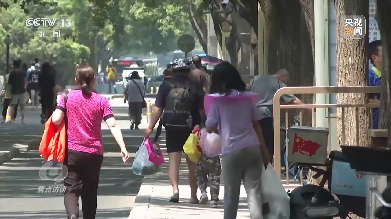在北京的各大景区,商家们把西瓜、酸梅汤等摆到最显眼的位置,游客们也都手拿雪糕、冷饮。
