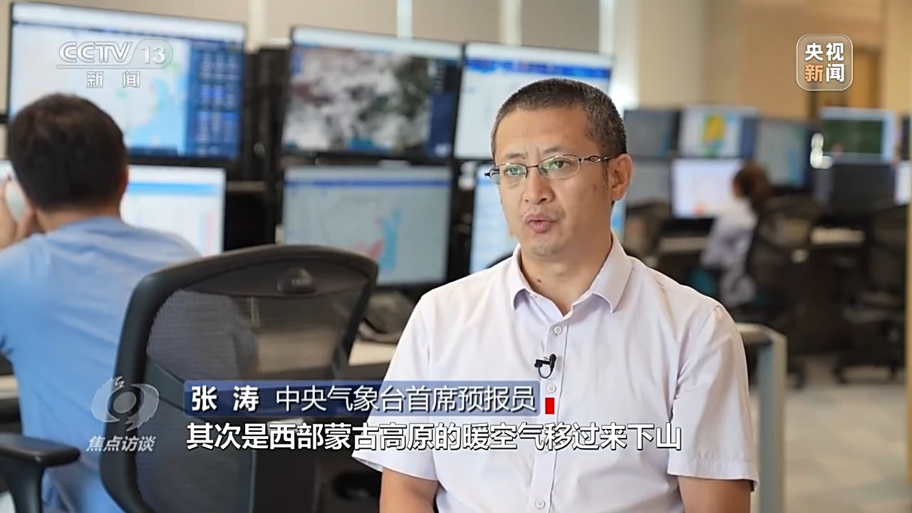 中央气象台首席预报员 张涛:在夏至前后背景下,晴晒升温比较显著,这是最直接的原因。其次是西部蒙古高原的暖空气移过来下山,也会加剧这样的高温。