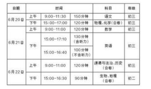 湖北省中考文化考试时间为每年6月20日-6月22日,考试时间安排如图。