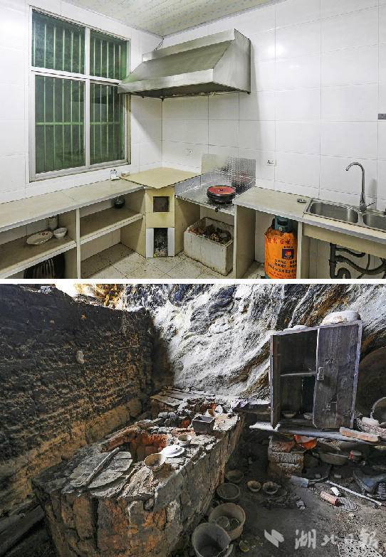 (罗显成现在住房中的厨房与罗显成在岩屋中使用的厨房。)