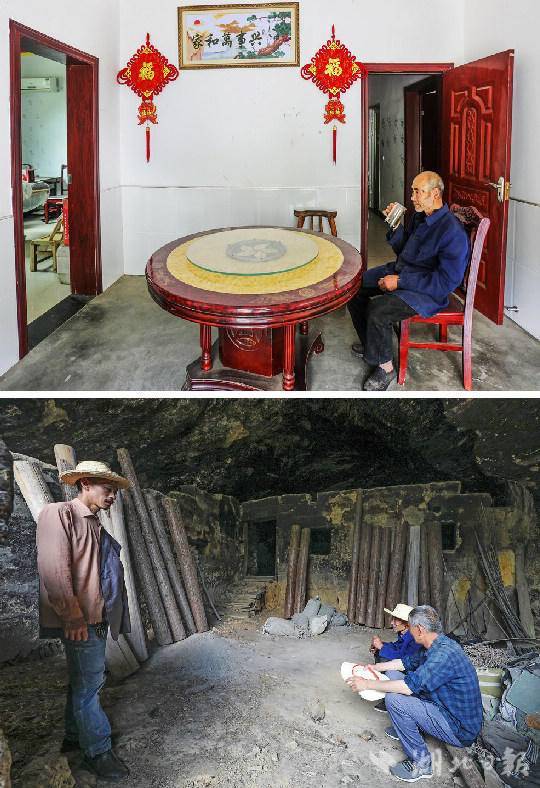 (罗显成现在住房中的客厅与罗家岩屋中的客厅。)