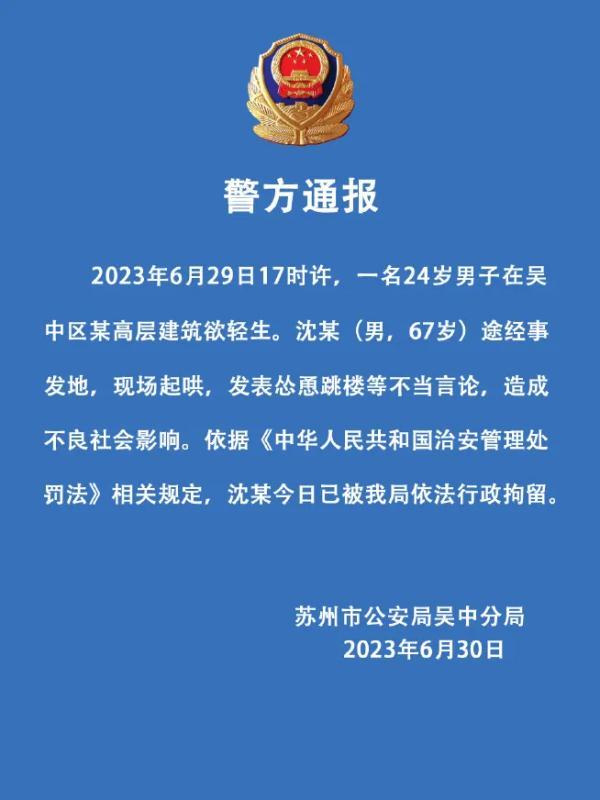 2023年6月29日17时许,一名24岁男子在吴中区某高层建筑欲轻生。沈某 (男,67岁)途经事发地,现场起哄,发表怂恿跳楼等不当言论,造成不良社会影响。依据《中华人民共和国治安管理处罚法》相关规定,沈某今日已被我局依法行政拘留。