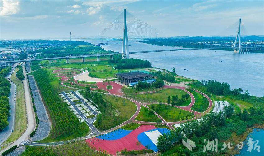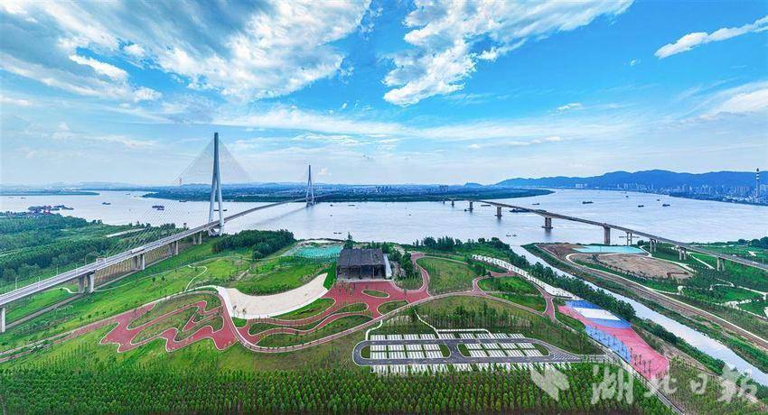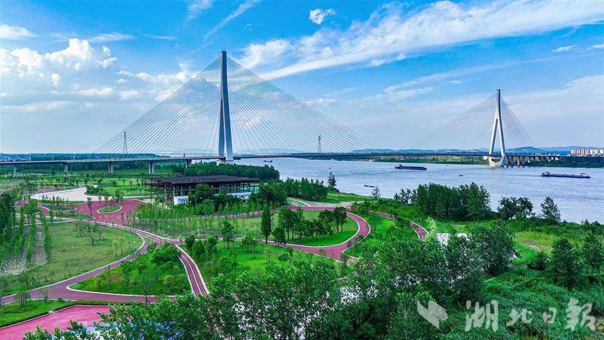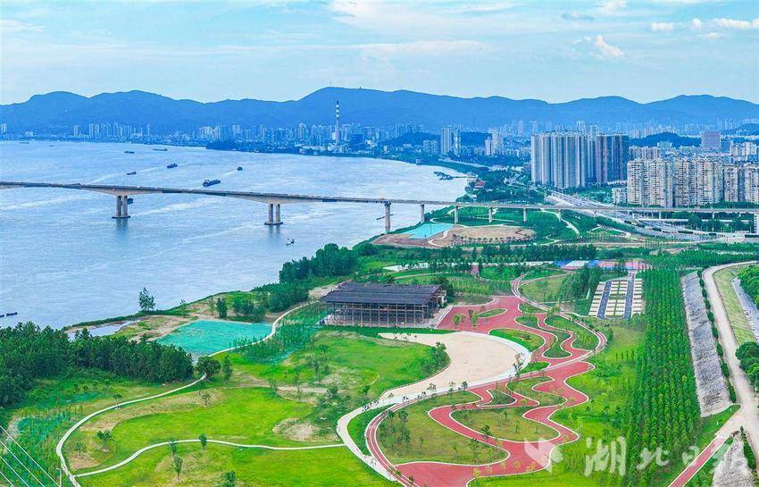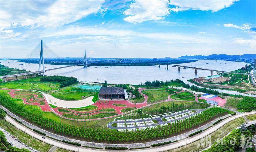 6月28日,蓝天白云下,即将亮相的黄石郊野生态港江滩公园景美如画。近年来,黄石实施长江岸线综合整治工程,加速建成鄂州界至西塞山全长约14公里的城区江滩风光带,将沿江公园串珠成链,昔日“工业锈带”转变为滨江“生活秀带”。(湖北日报全媒记者 薛婷 通讯员 周巍 摄)