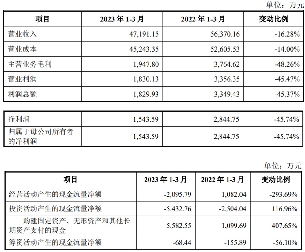 2023年1-3月,公司实现营业收入47,191.15万元,同比下降16.28%;净利润/归属于母公司所有者的净利润为1,543.59万元,同比下降45.74%;经营活动产生的现金流量净额为-2,095.79万元,同比下降293.69%。