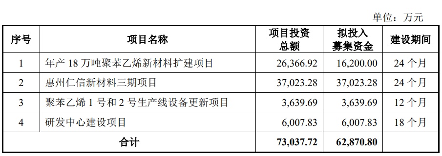 仁信新材本次公开发行募集资金总额为96,661.64万元,扣除发行费用后募集资金净额为88,728.27万元。公司最终募集资金净额比原计划多25,857.47万元。仁信新材2023年6月27日披露的招股说明书显示,公司拟募集资金62,870.80万元,用于年产18万吨聚苯乙烯新材料扩建项目、惠州仁信新材料三期项目、聚苯乙烯1号和2号生产线设备更新项目、研发中心建设项目。