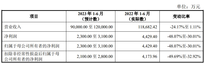 2023年1-6月,仁信新材预计营业收入为90,000万元至120,000万元,同比变动-24.17%至1.11%;预计2023年上半年净利润/归属于母公司所有者的净利润为2,300万元至3,100万元,同比变动-48.07%至-30.01%;预计2023年上半年扣除非经常性损益后归属于母公司所有者的净利润规模为2,100万元至2,800万元,同比变动-49.69%至-32.92%。