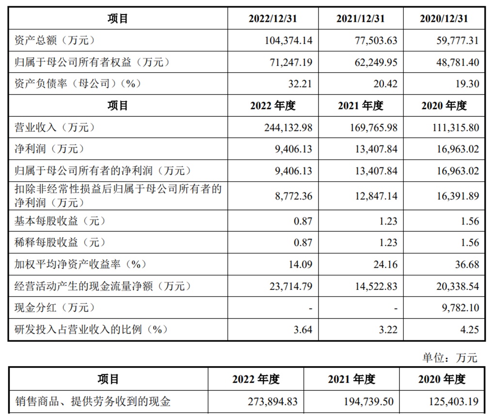 2020年至2022年,仁信新材的营业收入分别为111,315.80万元、169,765.98万元和244,132.98万元;净利润/归属于母公司所有者的净利润分别为16,963.02万元、13,407.84万元和9,406.13万元;扣除非经常性损益后归属于母公司所有者的净利润分别为16,391.89万元、12,847.14万元和8,772.36万元。