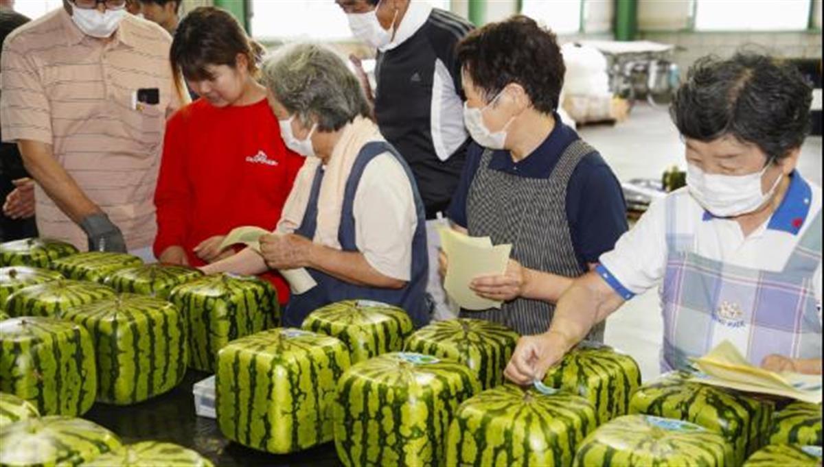 方形西瓜外形如骰子般,每边长约18厘米,约在50年前由香川县的生产小组研发,初衷是替当地农业带来活力。西瓜在生长至一定大小后,便被放入箱型容器内定型。目前,共有8家农户生产这种西瓜,批发价约为每个1万日元(约合人民币500元),预计到7月中旬将出货约300个。受2023年6月雨水过多影响,2023年方形西瓜出货量比2022年减少六成,但品质不变。