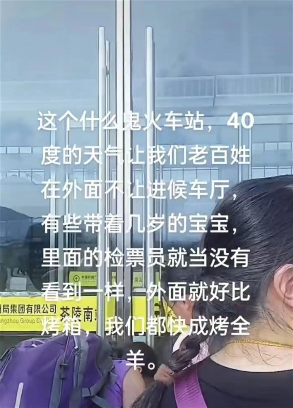 此前的6月17日,有网友反映河南唐河火车站不到时间不让进候车厅,外面下大雨只能返回售票厅休息;6月23日,极目新闻报道,河北沧州青县火车站中午休息时锁门,多名旅客冒着40℃高温在候车室外苦等。