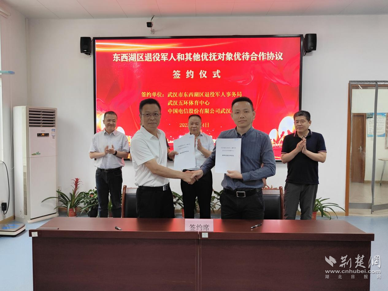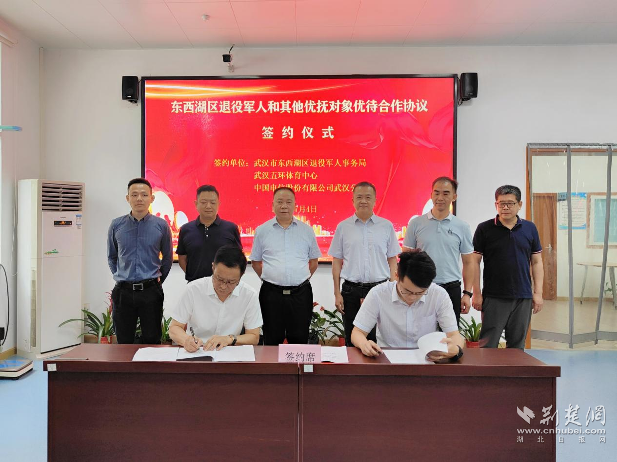荆楚网(湖北日报网)讯(通讯员朱铭 彭宏霞)7月4日,武汉市东西湖区退役军人事务局与武汉五环体育中心、中国电信武汉分公司等首批拥军优待合作单位签约,现役军人、退役军人和其他优抚对象可持有效证件享受签约单位优待服务。