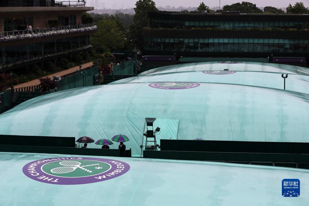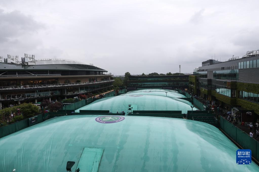 7月4日,温网的比赛场地被防水雨布遮盖起来。新华社记者 韩岩 摄