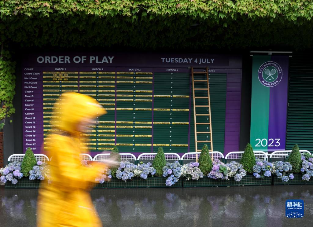 7月4日,一名女子穿着雨衣走过温网官方赛程公告板。新华社记者 韩岩 摄